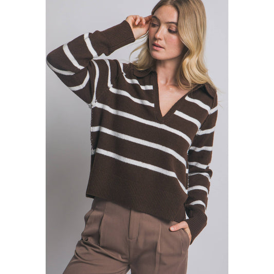V-Neck Stripe Polo Sweater - Dark Brown/Chocolate