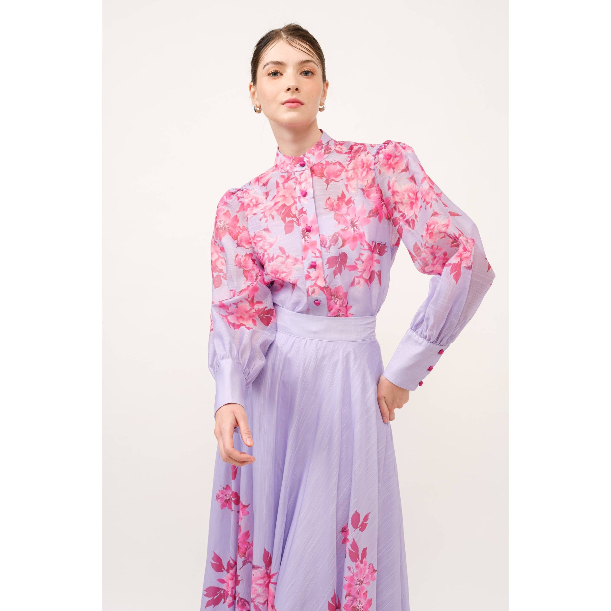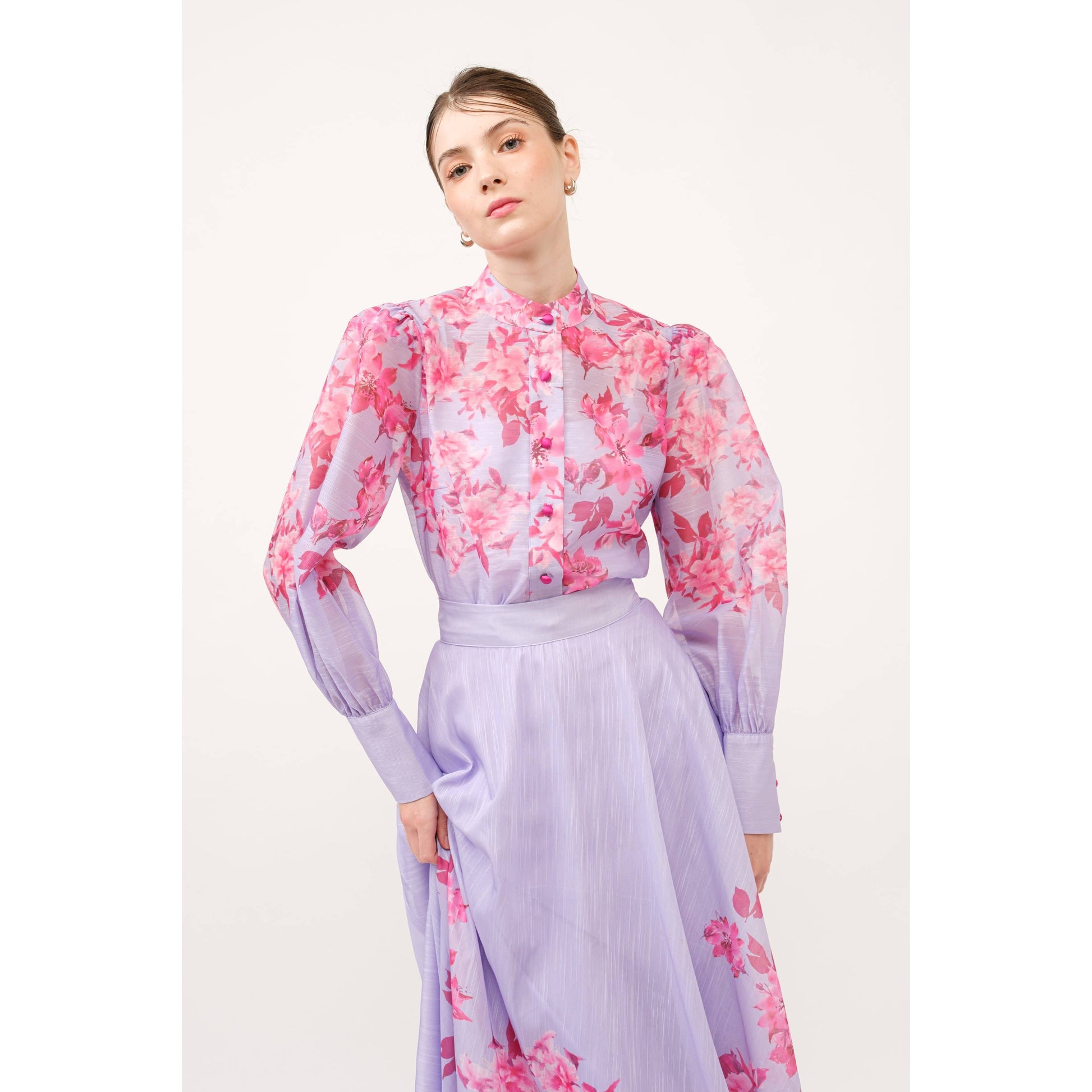 High Neck Floral Print Long Puff Sleeve Blouse - Cool Pinks & Purples