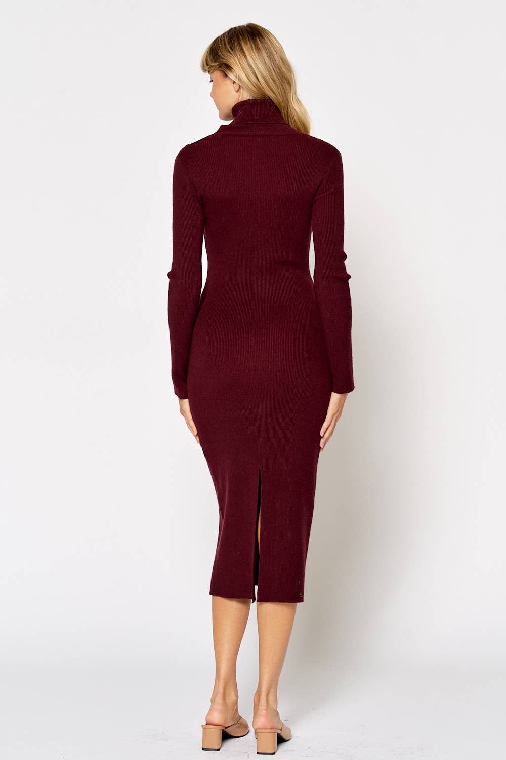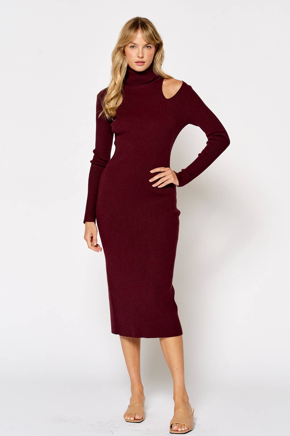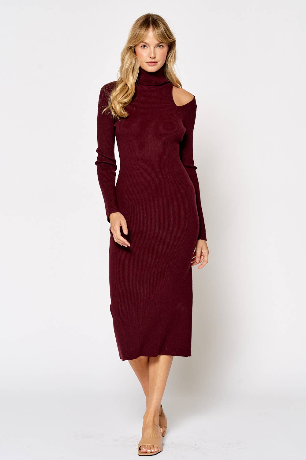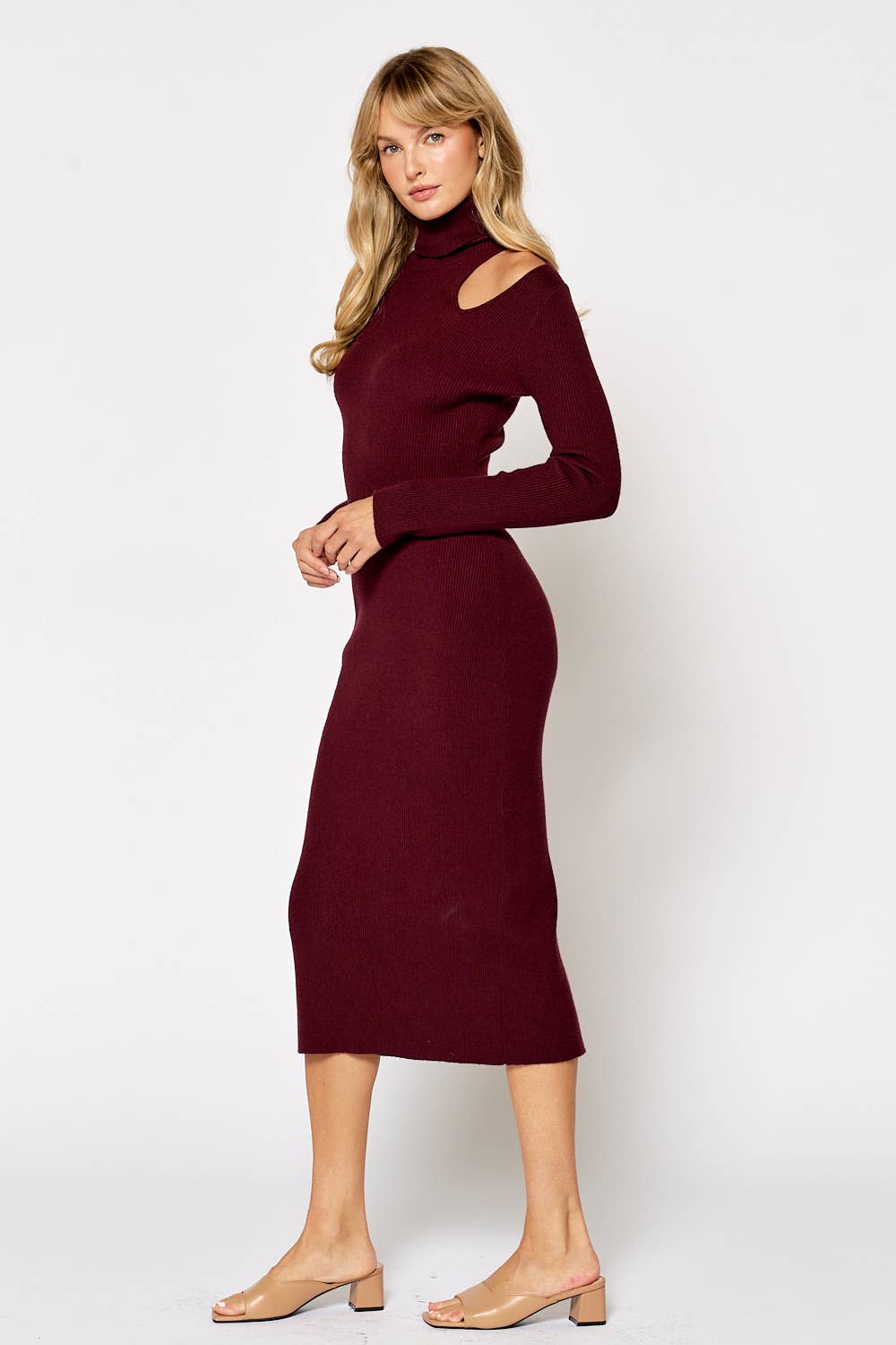 Cut Out Shoulder Turtle Neck Sweater Midi Dress - Deep Damson