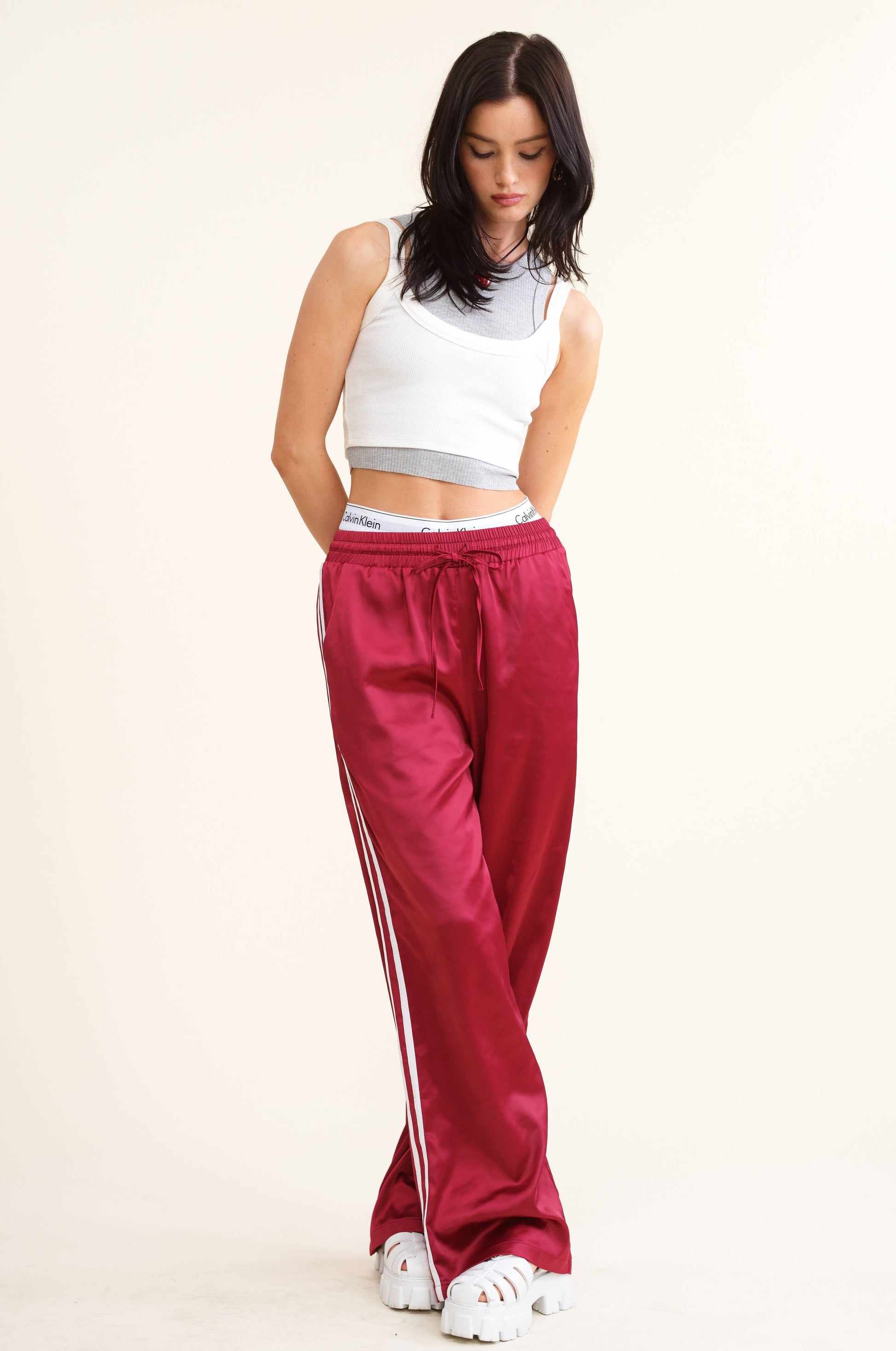 Sporty Satin-Effect Track Pants w/Contrast Stripes - Burgundy